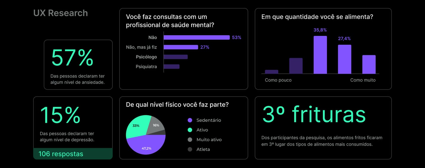 O objetivo desta pesquisa foi compreender a relação dos usuários com saúde mental, alimentação, sono e atividades físicas, e como esses fatores impactam sua vida cotidiana. Para isso, foram utilizados métodos como pesquisa exploratória, quantitativa com formulário online, qualitativa com especialista e teste de usabilidade com o protótipo.