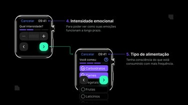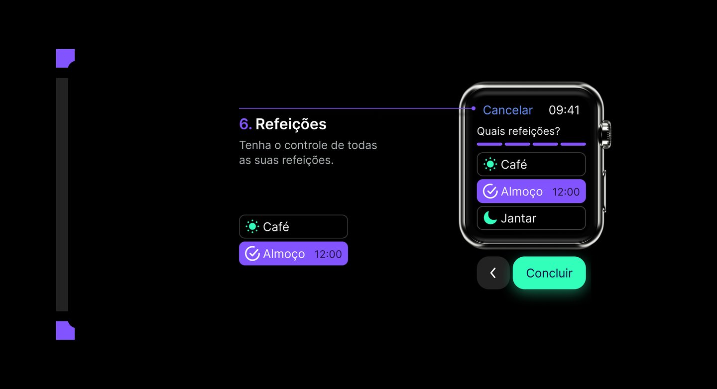 Desde a versão de baixa fidelidade foram encontrados problemas a serem resolvidos na interface. Além disso, um novo padrão visual foi criado, sendo necessário aplicar todo o guia de estilo, os tokens e a biblioteca de componentes a um protótipo de alta-fidelidade, levando em consideração as diretrizes do HIG (Human interface Guidelines), para que a interface fosse consistente com o sistema e familiar aos usuários das plataformas WatchOS e IOS.
