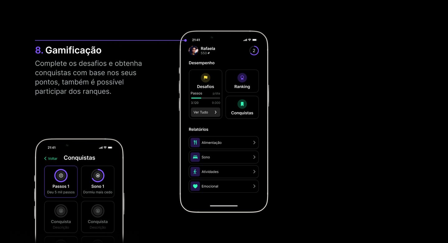 Implementei um sistema de gamificação para incentivar o uso frequente do app, já que ele depende do preenchimento diário de dados pelo usuário. O sistema concede pontos por atividades como preencher o diário, atingir metas, melhorar o desempenho e manter sequências de bons resultados.