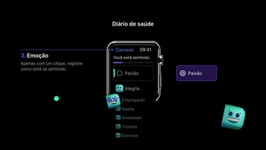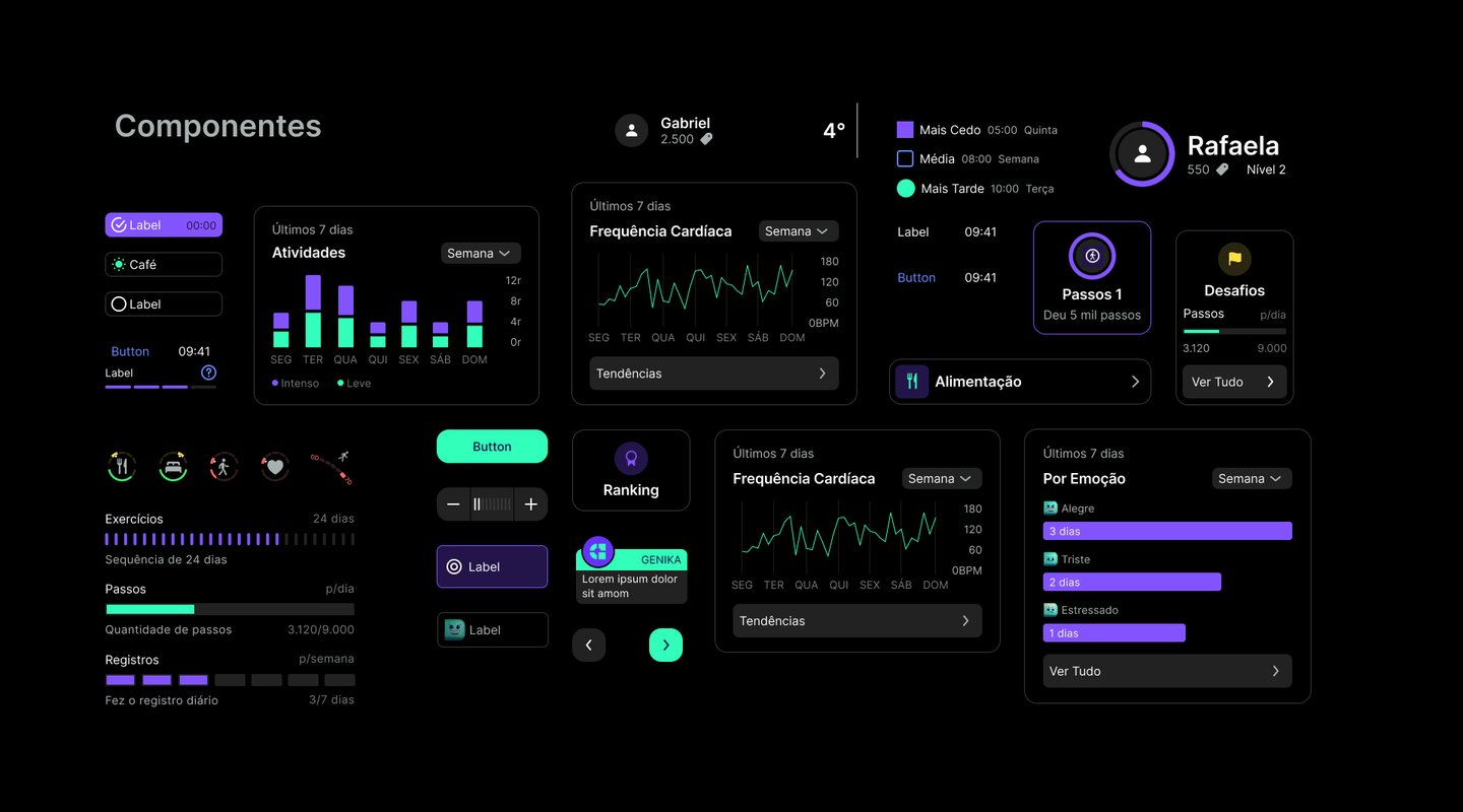 O primeiro protótipo em escala de cinza feito na ferramenta Figma conta com 18 telas, dentre elas a de onboarding, a tela principal e um diário para que o usuário possa inserir seus dados de alimentação e emocional, visto que, os dados de atividades físicas e sono (com a permissão dos usuários) já poderiam ser obtidos pelos sensores do dispositivo.