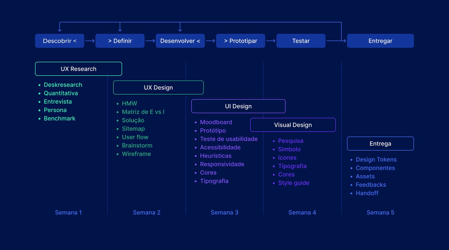 No início do desenvolvimento do projeto optei por estruturar o processo criativo utilizando o Design Thinking, mantendo o usuário como centro do projeto. Dividindo em 5 etapas principais: empatizar, definir, idealizar, prototipar e testar.
