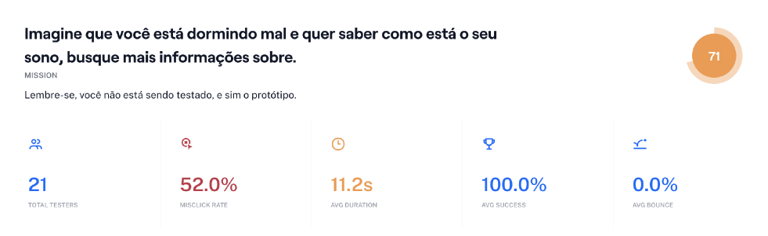 Para validar se as funcionalidades do aplicativo estavam intuitivas e navegáveis, criei um teste de usabilidade remoto não moderado pela plataforma Maze. No qual foram recrutadas 22 pessoas do público geral, ainda não focado nas personas pois estavam sendo validadas funcionalidades básicas que não exigiam esse nível de precisão.