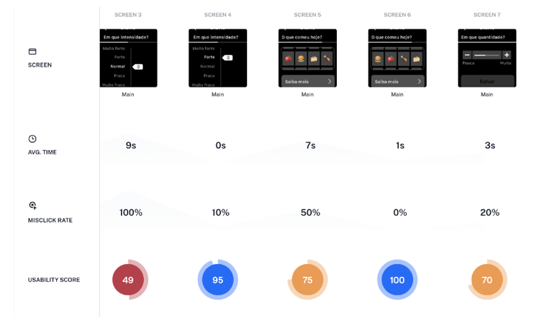 O fluxo que pedia a intensidade da emoção que o usuário sentiu naquele dia ficou com o resultado mais baixo, era um componente de arrastar o seletor para o local desejado. Porém, grande parte dos participantes estava clicando nos nomes, o que gerou uma confusão entre a interface e o modelo mental deles.